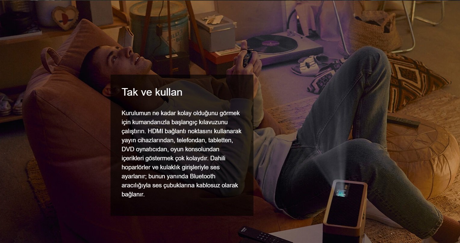 Tak ve kullan tipi, şık, kompakt ve taşınabilir lazer projektörü. İstediğiniz yerde, hemen hemen tüm yüzeylerde, her yönde, hatta gündüz ışığında bile kullanabilirsiniz. Maceralara atılmaya olanak verecek kadar hafiftir, kompakttır, kitap rafında bile özenle saklayabilirsiniz. Telefon, yayın cihazı, dizüstü bilgisayar, oyun konsolları ve daha fazlasından içerik görüntülemeyi sağlayacak derecede çok yönlüdür.